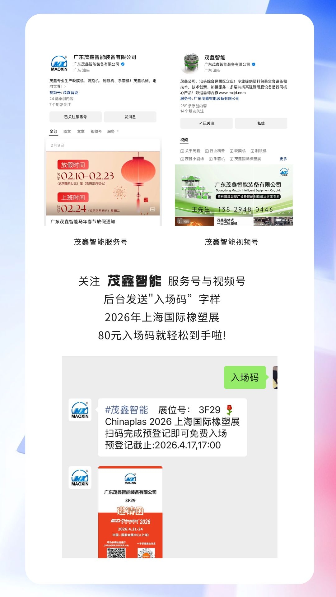 關(guān)注微信公眾號“廣東茂鑫智能裝備有限公司”,發(fā)送“入場碼”可免費領(lǐng)取價值80元入場碼。